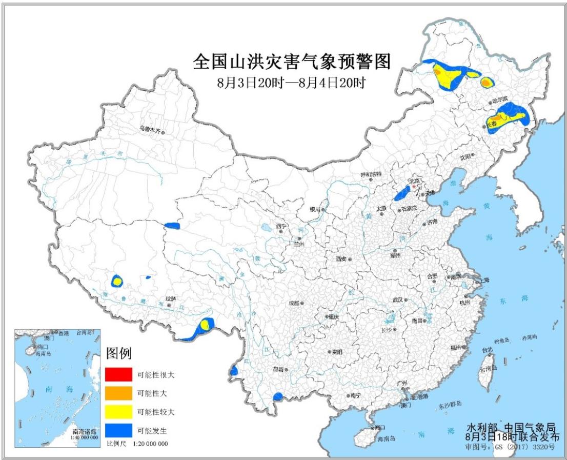 水利部、中国气象局8月3日18时联合发布橙色山洪灾害气象预警: