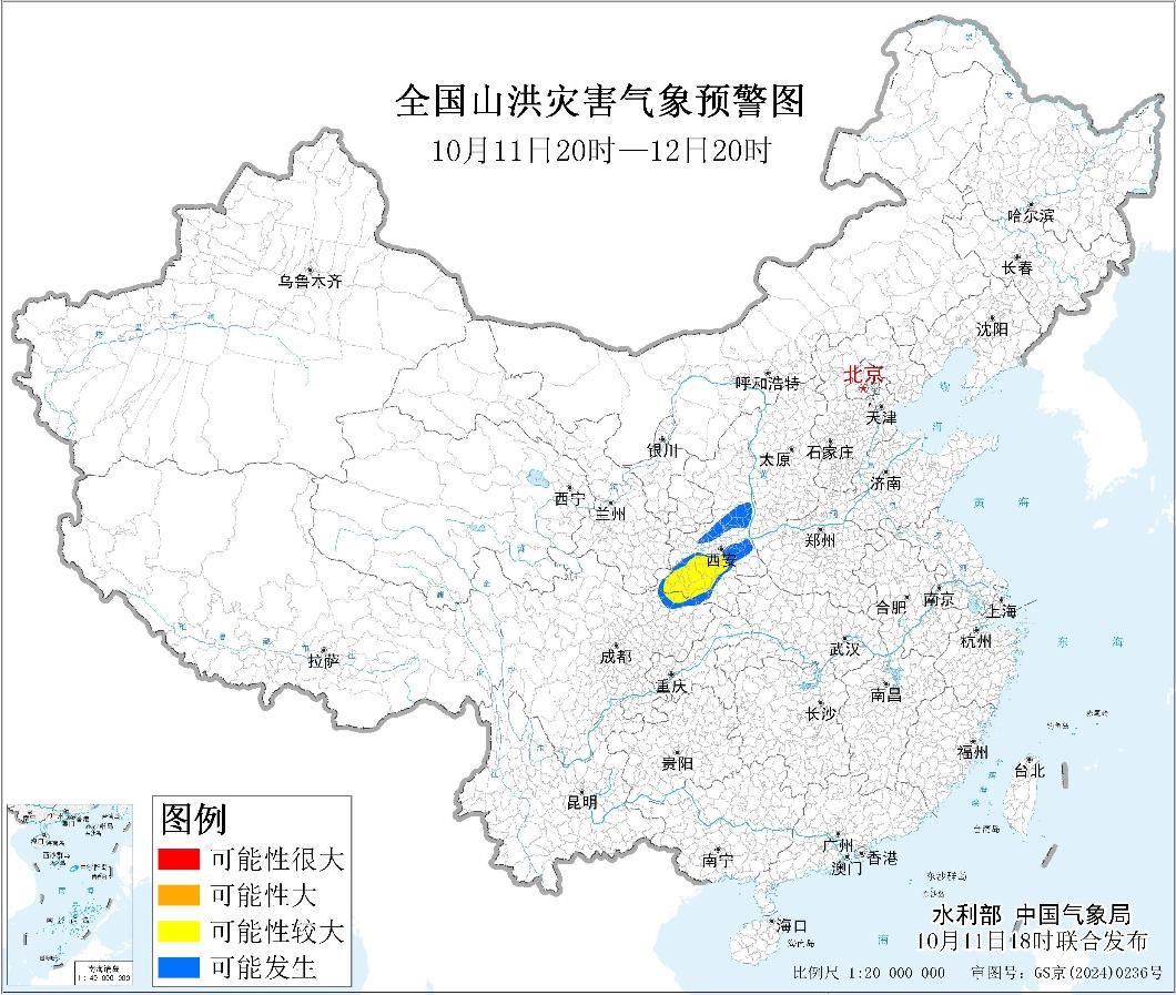 预计,10月11日20时至10月12日20时,四川东北部、陕西中部和南部等地部分地区可能发生山洪灾害(蓝色预警),其中,四川东北部、陕西南部局地发生山洪灾害可能性较大(黄色预警)。其他地区也可能因局地短历时强降水引发山洪灾害,请各地注意做好实时监测、防汛预警和转移避险等防范工作。
