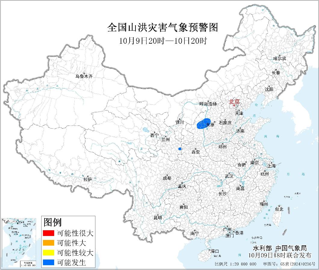 预计,10月9日20时至10月10日20时,山西西部、陕西东北部、甘肃东南部等地局地可能发生山洪灾害(蓝色预警)。其他地区也可能因局地短历时强降水引发山洪灾害,请各地注意做好实时监测、防汛预警和转移避险等防范工作。