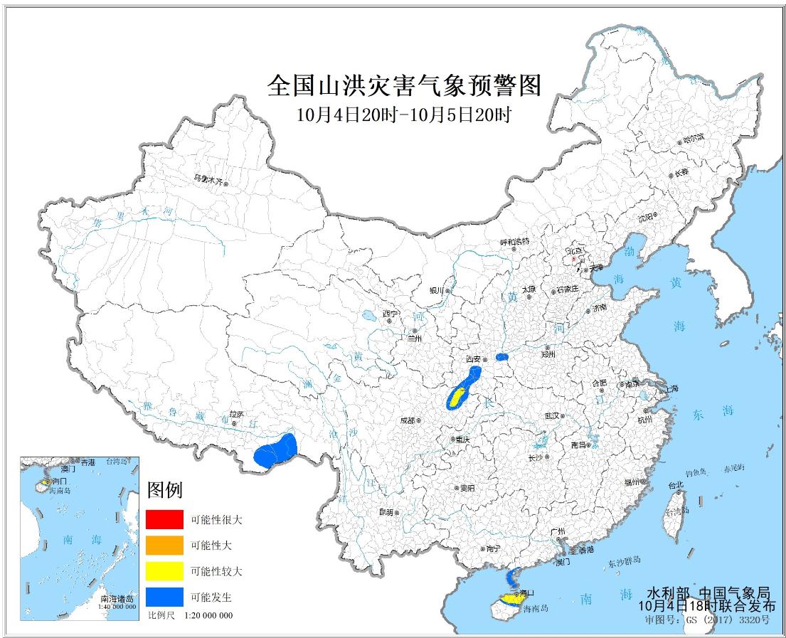 预计,10月4日20时至10月5日20时,河南西部、广东西南部、海南中北部、四川东北部、西藏东南部、陕西东部和南部等地部分地区可能发生山洪灾害(蓝色预警),其中,海南中北部、四川东北部、陕西南部局地发生山洪灾害可能性较大(黄色预警)。其他地区也可能因局地短历时强降水引发山洪灾害,请各地注意做好实时监测、防汛预警和转移避险等防范工作。