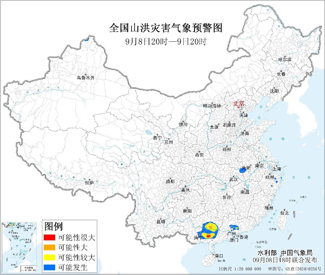 预计,9月8日20时至9月9日20时,广西中部和东部等地部分地区发生山洪灾害可能性大(橙色预警),其中,广西东南部局地发生山洪灾害可能性很大(红色预警)。其他地区也可能因局地短历时强降水引发山洪灾害,请各地注意做好实时监测、防汛预警和转移避险等防范工作。